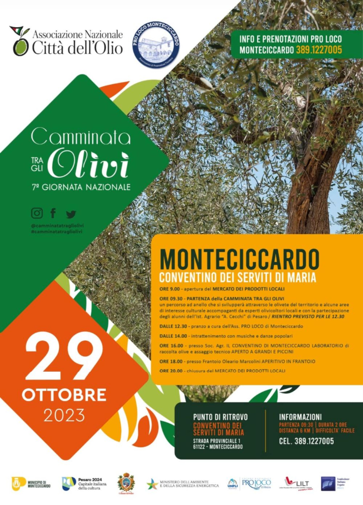Il programma di “Camminata tra gli Olivi” 2023 prevede, alle 9, l’apertura del Mercato nel Chiostro del Conventino. Alle 9:30 prevista la partenza, sempre dal Conventino dei Serviti di Maria, della passeggiata ad anello tra le più suggestive olivete locali che attraverserà vigneti, uliveti di Leccino, Raggiola, siepi di olmi e tamerici. Il percorso sarà guidato da esperti olivicoltori del territorio e degli alunni dell’istituto “A.?Cecchi” di Pesaro. Dalle 12.30 pranzo a base di prodotti locali di stagione e olio nuovo e a seguire musica e danze popolari con il duo “Leggermente a Sud”. Alle ore 16, nell’Azienda Agricola Conventino di Monteciccardo (via Giulio Turcato, 4) si svolgerà il laboratorio di raccolta e assaggio delle olive locali aperto a grandi e piccini (merenda facoltativa, costo 5€); alle 17, nel chiostro del Conventino, la scrittrice Giovanna Olivieri racconterà i “Ronzii”: “A fecondare i nostri fiori, i nostri ortaggi e i nostri alberi da frutto, non sono soltanto le api, ma una schiera di insetti preziosi e colorati…e molti di loro sono a rischio di estinzione!” (G. Olivieri, Ronzii, storie di api e impollinatori”, Pendragon edizioni 2023). Alle 18, infine, l’Azienda Agricola Frantoio Marcolini (via Arzilla 23/A, Villa Betti), proporrà una visita al frantoio e un aperitivo finale (facoltativo, costo 10€).