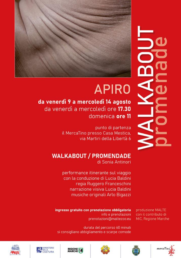 La presenza del progetto performativo di MALTE anche nel programma di questa edizione di uno dei più antichi e importanti festival folcloristici d’Italia rinsalda la stretta collaborazione fra la compagnia diretta da Sonia Antinori e l’amministrazione di Apiro che, quest’anno, ha scelto di offrire al suo pubblico l’ingresso gratuito alla passeggiata. Le passeggiate, attraverso i percorsi naturali e urbani caratteristici di Apiro, sono centrali in questa edizione di Walkabout / Promenade. Curato da Ruggero Franceschini, il progetto si avvale della ricerca visiva della fotografa Lucia Baldini e della colonna sonora originale di Arlo Bigazzi, musicista e compositore.