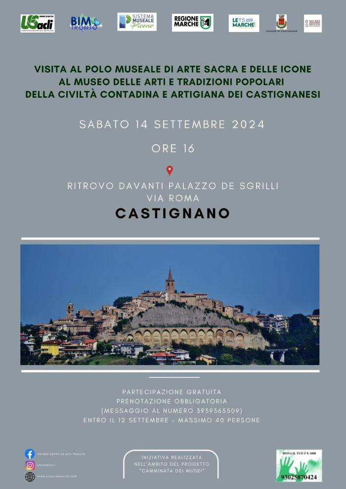 Roma. A seguire sono in programma la visita al Polo museale di arte sacra e delle icone e al Museo delle arti e tradizioni popolari, della civiltà contadina e artigiana dei castignanesi. La manifestazione è organizzata grazie al contributo di Bim Tronto e Regione Marche e alla collaborazione del Sistema museale Piceno, dei Musei sistini del Piceno col patrocinio del Comune di Castignano. La partecipazione all’evento è gratuita con un massimo di 40 presenze, ma occorre prenotare con un messaggio al numero 3939365509, entro il 12 settembre, indicando il proprio nome e cognome. Nel 2024 l’Unione Sportiva Acli provinciale Aps ha già realizzato 18 appuntamenti col progetto “Camminata dei musei” nel territorio di tre province (Ascoli Piceno, Fermo e Macerata) con oltre 950 presenze registrate