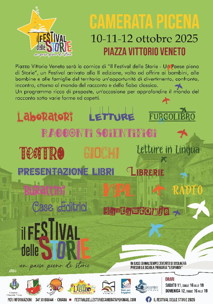 Si conferma per il 2025 la tre giorni di storie e racconti del “Festival delle storie-un paese pieno di storie ” presso piazza Vittorio Veneto a Camerata Picena. L’evento, organizzato dall’Associazione Acchiappasogni, dal Comune di Camerata Picena e dal Centro Sociale l’Incontro, con il patrocinio di Nati per Leggere Marche e con la collaborazione dell’IC “Matteo Ricci” di Polverigi, giunto alla II edizione, offre al suo corposo pubblico numerose iniziative aventi un unico filo conduttore: le storie ed il racconto. Venerdì 10 ottobre è la giornata dedicata alle scuole: la mattina il Festival va a scuola, con una serie di proposte dedicate agli alunni e alle alunne e, nel pomeriggio, le scuole collaborano alla