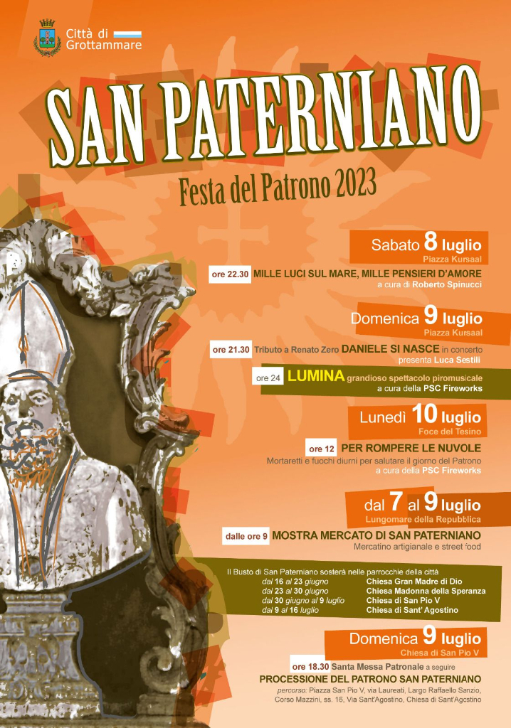 Accanto alle celebrazioni religiose, la manifestazione prevede quattro giorni di eventi con musica, mostra-mercato, eventi in spiaggia, street food e spettacolo piromusicale domenica a mezzanotte, per ricordare una delle iniziative più sentite dell’estate cittadina. Il programma: 7-8-9 luglio, Lungomare della Repubblica, dalle ore 16: Mostra Mercato di San Paterniano, con mercatino artigianale e street food, a cura della ASD Ciclistica Crocette; 8 luglio, piazza Kursaal, ore 22.30: Mille luci sul mare, Mille pensieri d’amore, accensione di lumini e desideri, a cura di Roberto Spinucci; 9 luglio, piazza Kursaal: -ore 21.30, Tributo a Renato Zero con il concerto del gruppo Daniele si nasce; presenta Luca Sestili; -ore 24, Lumina, spettacolo piromusicale, a cura della PSC Fireworks; 10 luglio, Foce del Tesino, ore 12: Per rompere le nuvole, mortaretti e fuochi diurni per salutare il giorno del patrono, a cura della PSC Fireworks. La partecipazione agli eventi è gratuita.