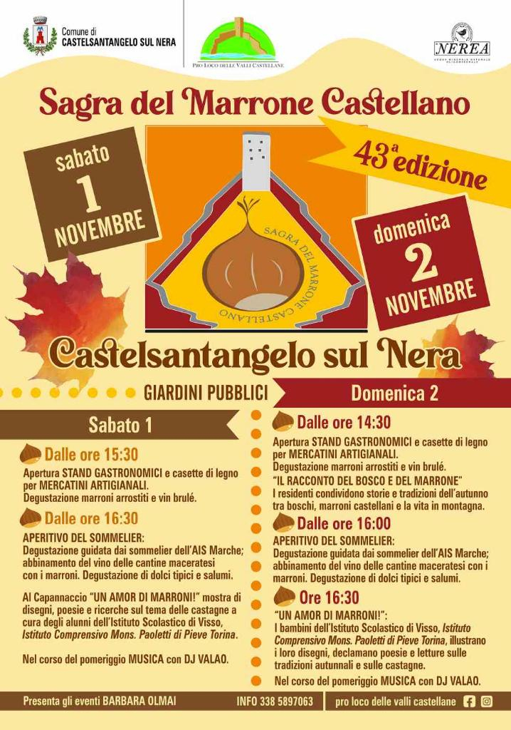 A Castelsantangelo sul Nera torna l'atteso appuntamento con la 43ª edizione della “Sagra del Marrone Castellano”. L'evento, organizzato dalla Pro Loco delle Valli Castellane con il patrocinio del Comune di Castelsantangelo sul Nera e il sostegno di Acqua Nerea, animerà i Giardini Pubblici del paese nel weekend di sabato 1 e domenica 2 novembre.