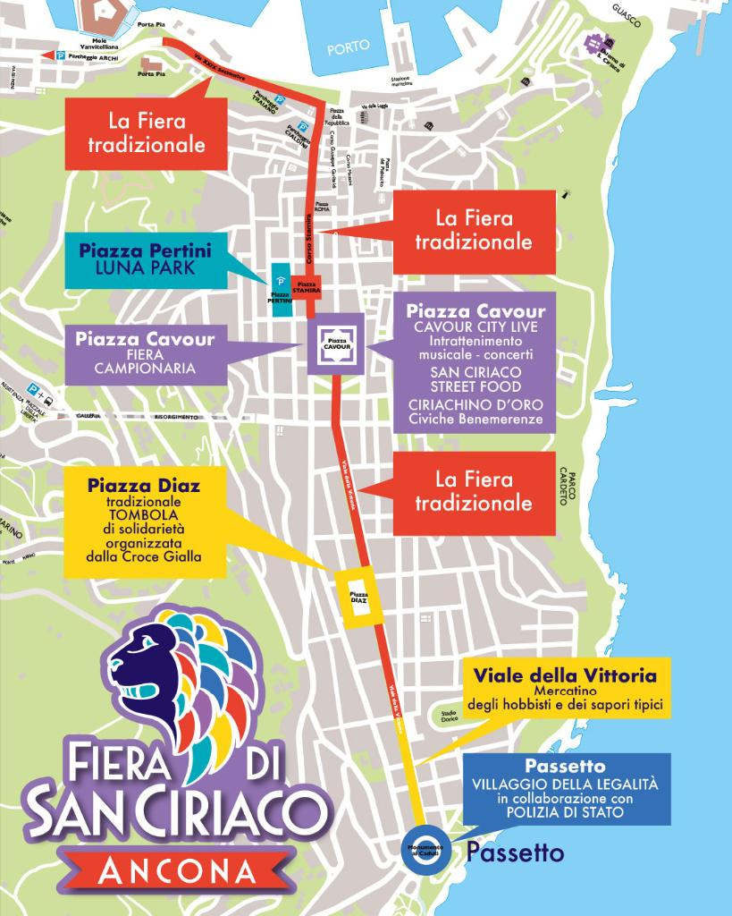 I luoghi e le esposizioni La Fiera Tradizionale troverà posto al Viale della Vittoria e in Corso Stamira fino a Via XXIX Settembre; la mostra mercato del Mercatino Artigiano al Viale della Vittoria; la Fiera Campionaria e le Associazioni a Piazza Cavour; San Ciriaco Street Food, in Piazza Cavour: nell’ambito di San Ciriaco Street Food è previsto, come nel 2025, un programma di intrattenimenti musicali, quest'anno nella centralissima piazza Cavour, con concerti live e DJ set; nell’ambito della manifestazione è prevista anche la consegna delle civiche benemerenze con la “Festa dei Ciriachini 2026”. Canalone di Piazza Cavour: come lo scorso anno, confermata la partnership con Co.GE.VO. (Consorzio di gestione della pesca delle vongole nel Compartimento marittimo di Ancona): infatti un punto ristoro dedicato alla degustazione delle tipicità di mare. CO.GE.VO. ANCONA parteciperà alla fiera di San Ciriaco al fine di promuovere il proprio prodotto (vongola) frutto di una filiera garantita trasparente di qualità nell’ambito del progetto Mare Magnum . Il prodotto sarà valorizzato in un contesto incentrato sulla promozione della territorio di Ancona. Nel menù saranno presenti: spaghetto alle vongole, tagliatella allo scoglio, soutè di vongole, frittura di pesce, grigliata mista ecc……Lo stand sarà aperto dalla cena del 30 aprile alla cena del 4 maggio dalle ore 10.00 alle ore 24.00. Passetto: qui troverà posto il Villaggio della Legalità, iniziativa in collaborazione con la Polizia di Stato. Piazza Pertini: qui saranno collocati gli intrattenimenti per tutte le età con anche il parco giochi. L'area sarà aperta con le sue venti attrazioni già dal 26 aprile e operativa fino al 10 maggio. La Tombola - La Croce Gialla organizza la tradizionale “Tombola di solidarietà” che rappresenta un appuntamento molto popolare a conclusione della Fiera. La vendita delle cartelle avviene prima e durante la Fiera. Estrazione premi nella serata del 4 maggio in piazza Diaz. Per il Patrono - La Cattedrale di San Ciriaco è il luogo rituale privilegiato per i festeggiamenti del Patrono. Com'è consuetudine, al mattino del 4 maggio, vi si tengono le celebrazioni religiose dedicate al Santo. II programma delle funzioni religiose sarà pubblicizzato direttamente dalla Curia.