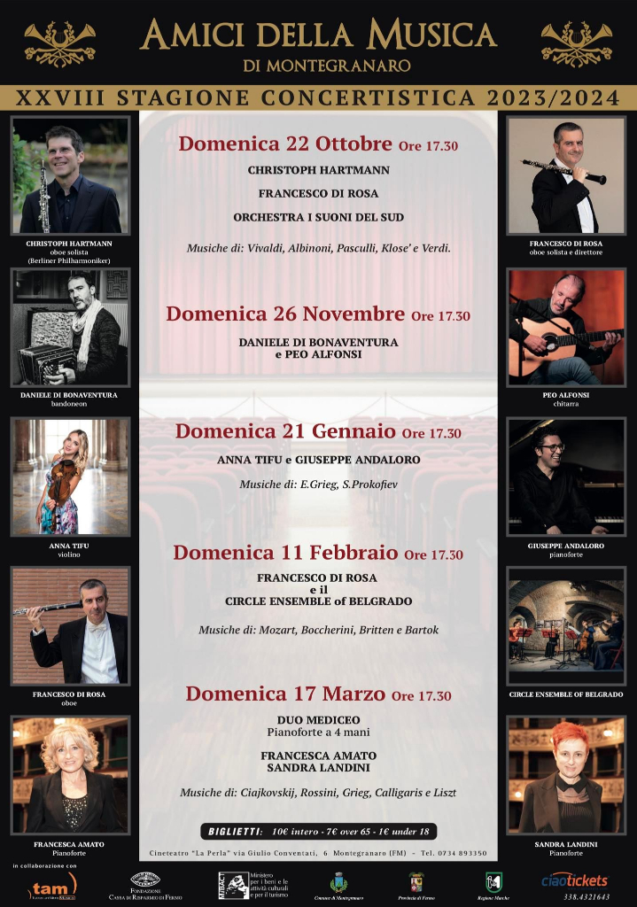 La Stagione Concertistica, organizzata dagli Amici della Musica di Montegranaro, compie 28 anni.“Anni ricchi di soddisfazioni – spiega il direttore artistico, nonché oboista di fama internazionale, Francesco Di Rosa -. Ringrazio per questo l’amministrazione comunale e i nostri sponsor. Come sempre la Stagione si caratterizza per pochi concerti di assoluta qualità, una filosofia vincente nel tempo; siamo sempre rimasti coerenti, mettendo la musica al primo posto, proponendo al pubblico pagine importanti della storia della musica suonate dai migliori artisti internazionali in circolazione”. Quest'anno la rassegna viene inaugurata il 22 ottobre con due grandi interpreti dell’oboe: il già citato Francesco Di Rosa e Christoph Hartmann, oboe solista dei Belriner Philharmoniker. Il duo proporrà musiche di Vivaldi, Albinoni, Pasculli, Klose’ e Verdi. “Antonio Pasculli – sottolinea Di Rosa – musicista attivo nell’Ottocento, era considerato il Paganini dell’oboe, un vero virtuoso dello strumento. Sarà bello ascoltare le sue fantasie su brani d'opera interpretate da Christoph. Con noi sul palco ci sarà la quotata Orchestra “I Suoni del Sud” di Foggia”.