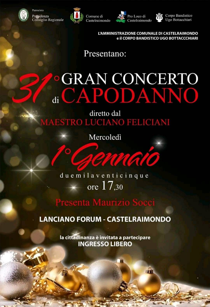 Siamo giunti alla 31esima edizione del Gran Concerto di Capodanno a Castelraimondo. L’amministrazione comunale e il corpo bandistico Bottacchiari, con il sostegno della Pro Loco di Castelraimondo e della Presidenza del Consiglio Regionale, organizzano anche quest’anno il Gran Concerto di Capodanno. Protagonista proprio il corpo bandistico locale diretto dal Maestro Luciano Feliciani, con la conduzione dell’iniziativa affidata al noto presentatore Maurizio Socci.