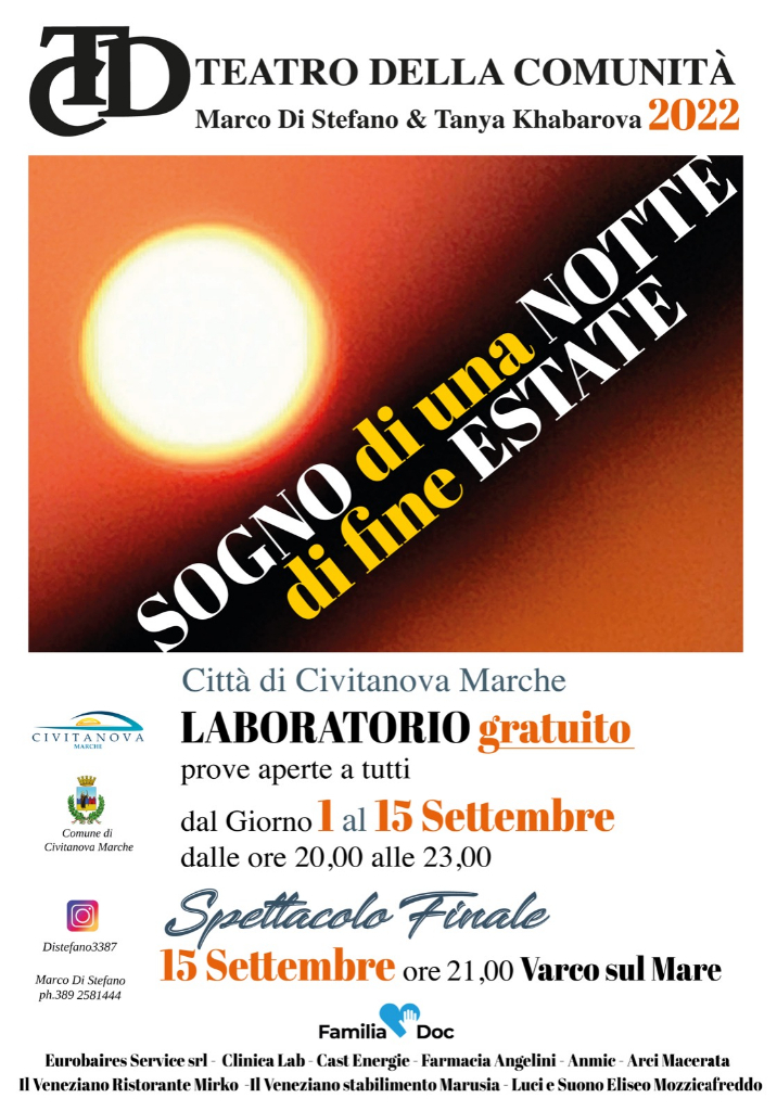 Tutto pronto per lo spettacolo finale del Teatro della Comunità, che andrà in scena giovedì 15 settembre, alle ore 21,00, al Varco sul Mare di Civitanova Marche (ingresso gratuito).